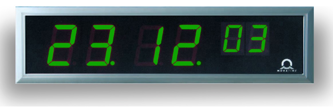 Сегментное табло; 6 цифр - час/мин/сек; односторонние; высота цифр - 100/57 мм; дальность распознавания символов 40 м; синхронизация DCF 77, MOBALine и минутные импульсы 24 В; показ даты; время 12/24 ч; цвет цифр - красный; питание 220 В AC; монтаж на стену; размеры 652x169x39 мм; вес 3,1 кг; алюминиевый корпус черного цвета IP40.