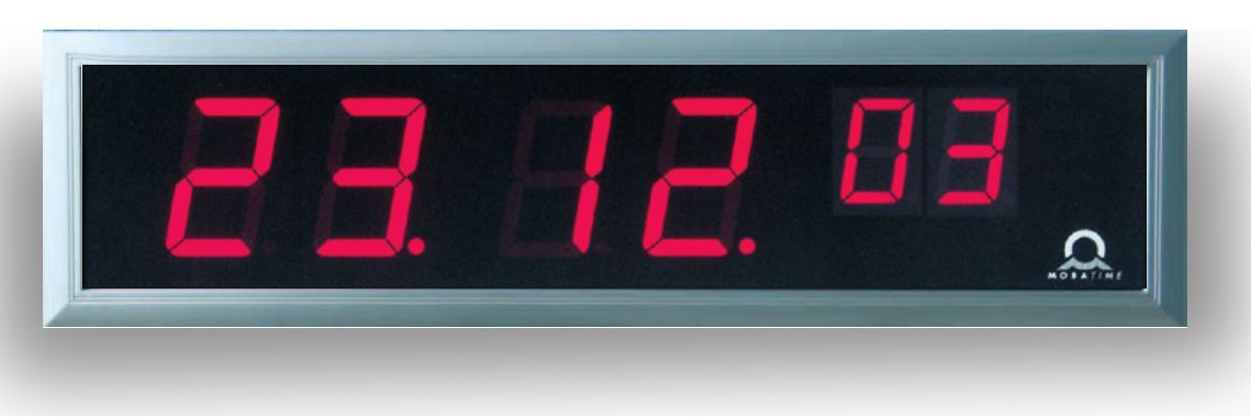 Сегментное табло; 6 цифр - час/мин/сек; односторонние; высота цифр - 57/38 мм; дальность распознавания символов 25 м; синхронизация DCF 77, MOBALine и минутные импульсы 24 В; показ даты; время 12/24 ч; цвет цифр - красный; питание 220 В AC; монтаж на стену; размеры 423x118x39 мм; вес 1,8 кг; алюминиевый корпус черного цвета IP40.