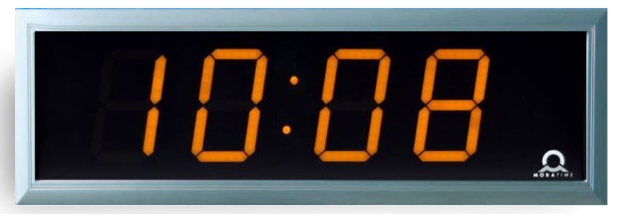 Сегментное табло; 4 цифры - час/мин; односторонние; высота цифр - 100 мм; дальность распознавания символов 40 м; синхронизация DCF 77, MOBALine и минутные импульсы 24 В; показ даты; время 12/24 ч; цвет цифр - желтый; питание 220 В AC; монтаж на стену; размеры 510x169x39 мм; вес 2,4 кг; алюминиевый корпус черного цвета IP40.