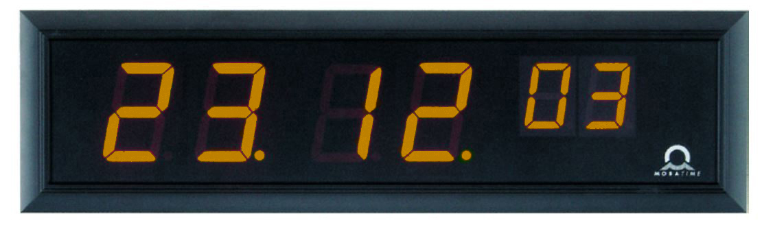 Сегментное табло; 6 цифр - час/мин/сек; односторонние; высота цифр - 57/38 мм; дальность распознавания символов 25 м; синхронизация DCF 77, MOBALine и минутные импульсы 24 В; показ даты; время 12/24 ч; цвет цифр - красный; питание 220 В AC; монтаж на стену; размеры 423x118x39 мм; вес 1,8 кг; алюминиевый корпус черного цвета IP40.