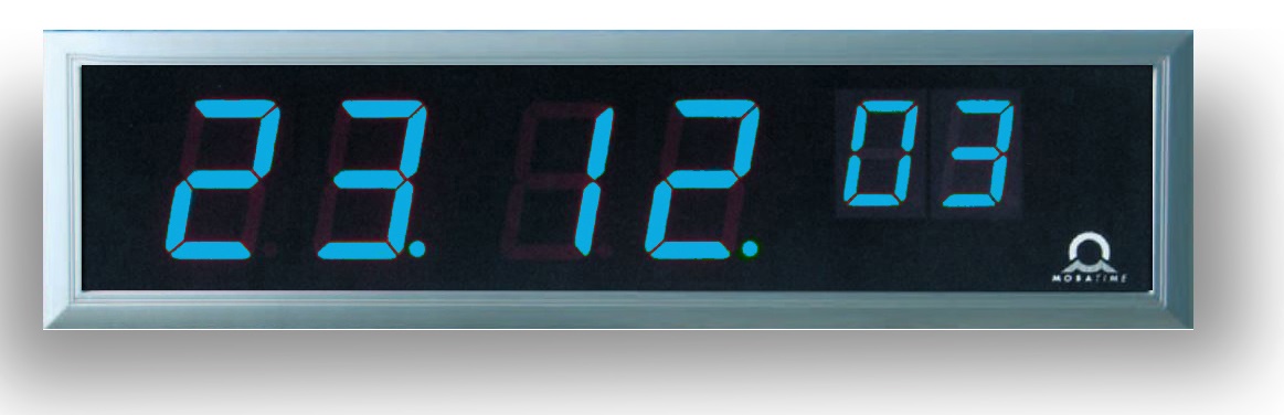 Сегментное табло; 6 цифр - час/мин/сек; односторонние; высота цифр - 100/57 мм; дальность распознавания символов 40 м; синхронизация DCF 77, MOBALine и минутные импульсы 24 В; показ даты; время 12/24 ч; цвет цифр - синий; питание 220 В AC; монтаж на стену; размеры 652x169x39 мм; вес 3,1 кг; алюминиевый корпус черного цвета IP40.