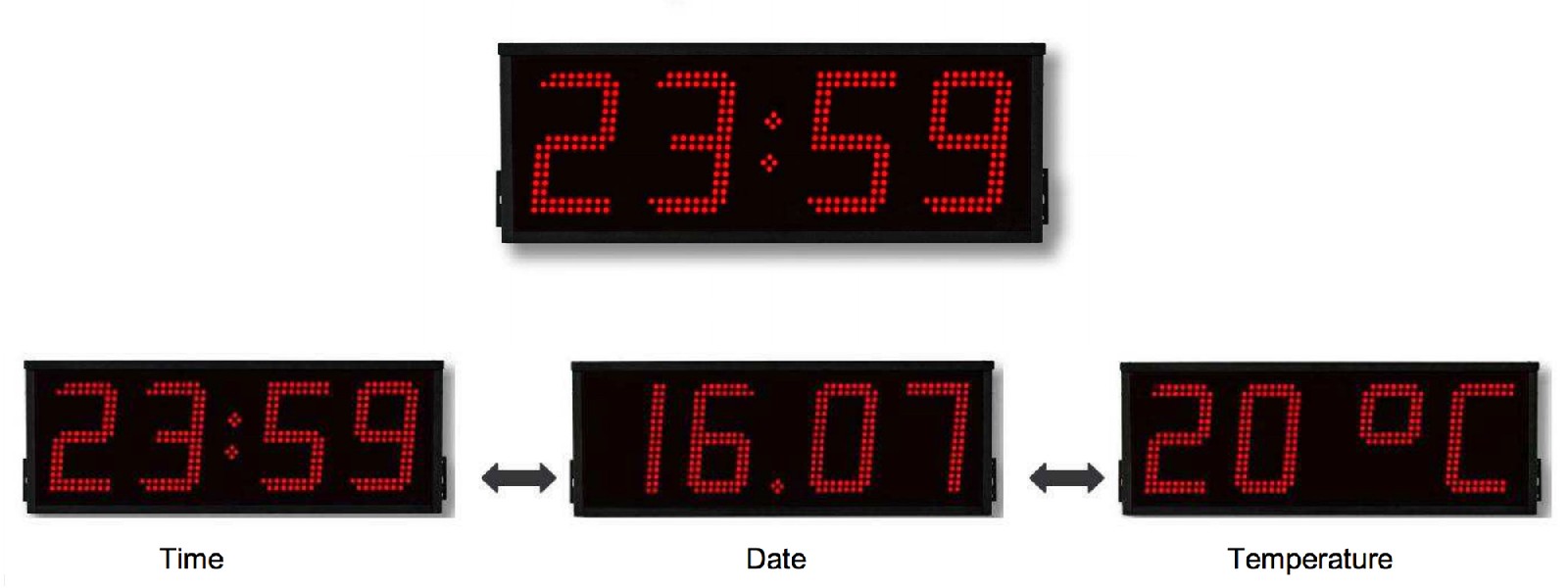 Часы оснащены точечным матричным дисплеем красного цвета. Время может отображаться в двух режимах: 12 или 24 часа. Помимо этого есть функция поочередного отображения: часы и минуты, день и месяц, а также температура воздуха. Каждый из вышеперечисленных показателей отображается поочередно с регулируемым интервалом времени от 1 до 25 секунд. Высота символов 190 мм обеспечивает хорошую читаемость на расстоянии до 75 метров. Дополнительным преимуществом является возможность сохранения данных до 2 дней в случае, если происходит сбой сети питания. Дополнительно часы поддерживают автоматическое переключение с летнего времени на зимнее и наоборот.